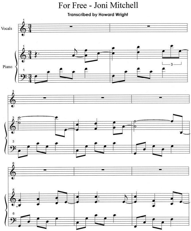 The left hand plays the usual root-5th-octave pattern that is common to most Joni piano songs. This pattern is used throughout the whole song, with a few small variations. The first few bars of the introduction above illustrate the basic left-hand pattern. Starting on F we have: F-C-F-C-F (root-5th-octave-5th-octave), using four 8th notes and one quarter note.